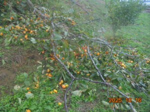 目の前でいきなりカキの木の枝が折れて落ちました。