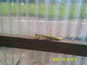 親戚を見送るために木立前まで行くと、プレハブ入口の頭上辺りにいるカマキリに目が留まりました。