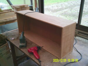 今日は、その再利用のために残してあった廃材〈12㎜厚のコンパネと2,5㎜厚のベニヤ〉を使って棚を2つつくりました。