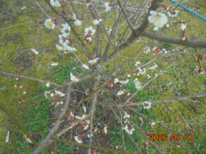 木立に戻ると、白い梅〈南高〉の花が咲いていました。(右上)