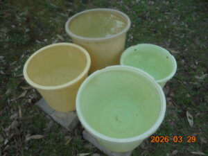 大小の容器4つに合わせて200ℓほどの水が溜まっています。