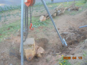 ③ チェーンブロックで切株の引っこ抜きを試みるも上がらず