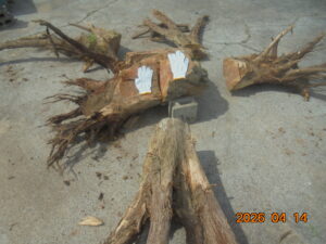 今回引き抜いた切株のパーツを並べてみました。(右上写真)